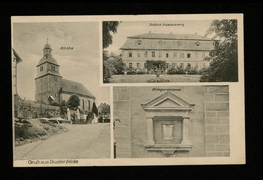 Gesamtansicht, Kirche, Gasthof z. Preussischen Hofe. Inh.: Rob. Jünemann, Restaurationszimmer des Gasthofes z. Preussischen Hofe |