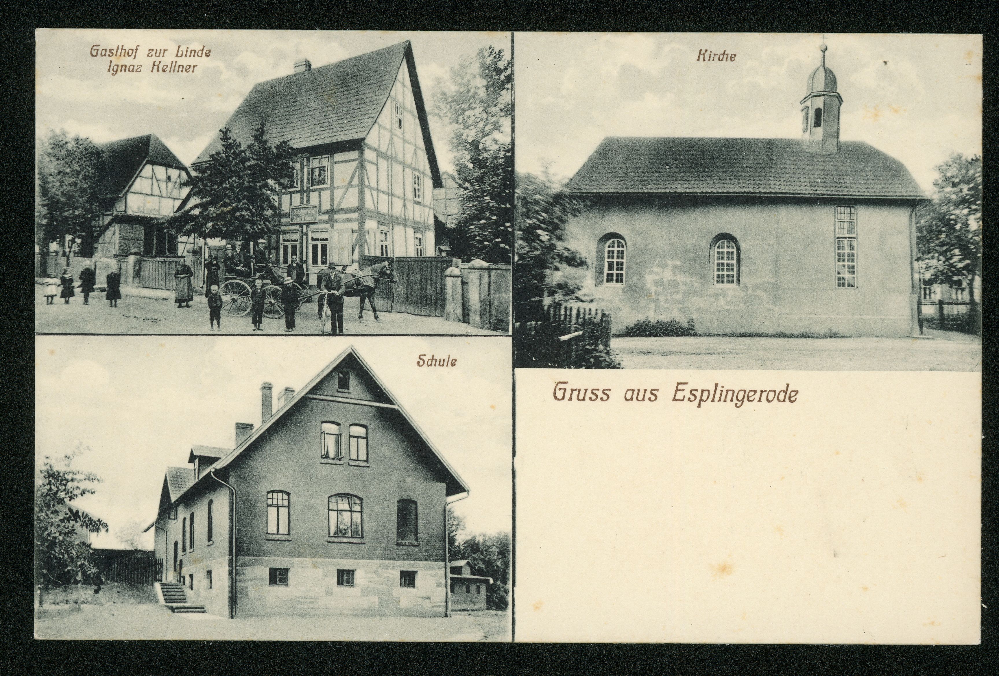 Ort Esplingerode Beschreibung oberes Exemplar von: Sammlung: H.M.D. Motive Gasthof zur Linde Ignaz Kellner Schule Kirche Format klein Verlag Aloys Mecke, Duderstadt Bestell- oder Individualnummer - Tags Gasthaus Gastwirtschaft Pferdekutsche