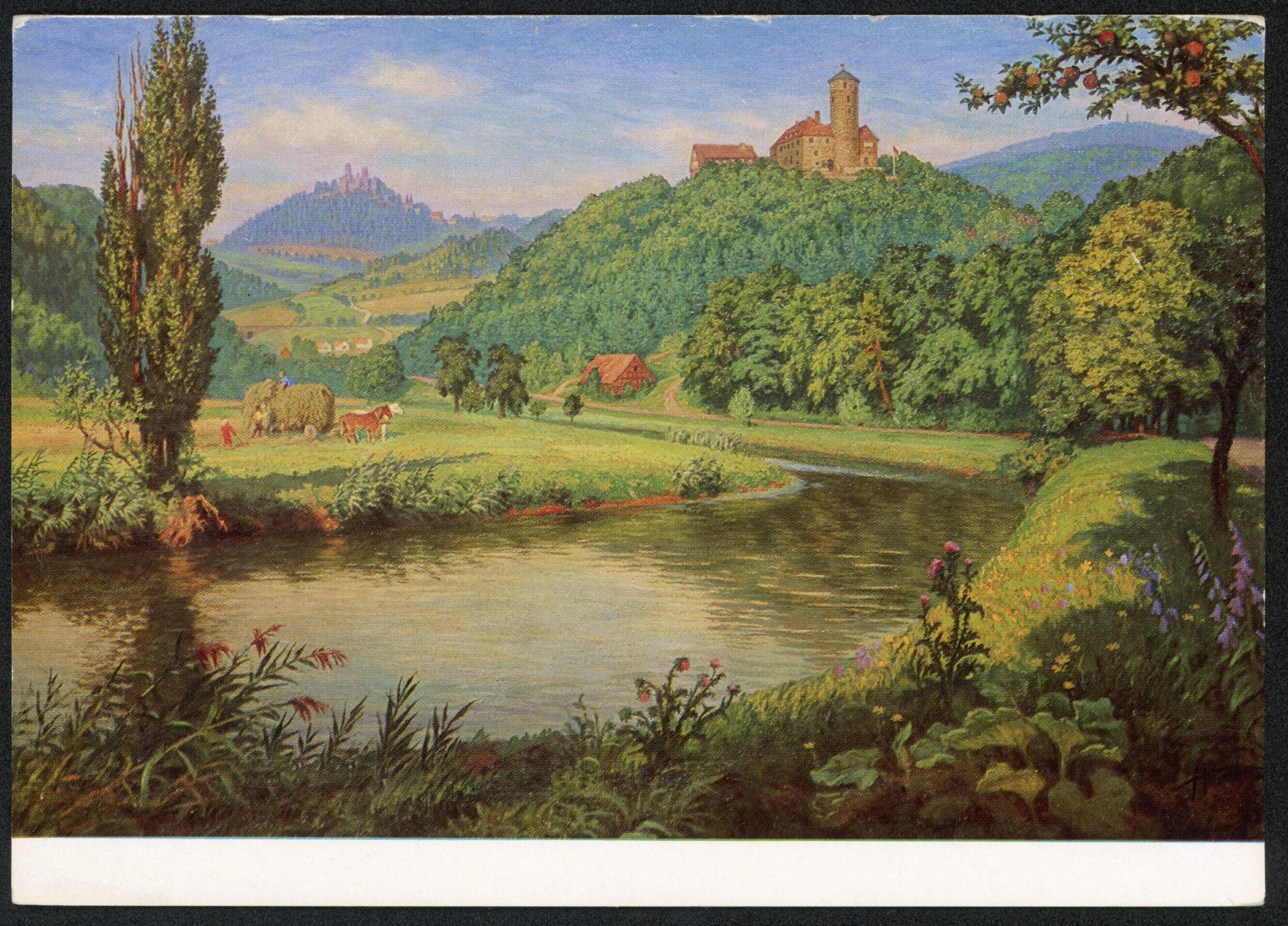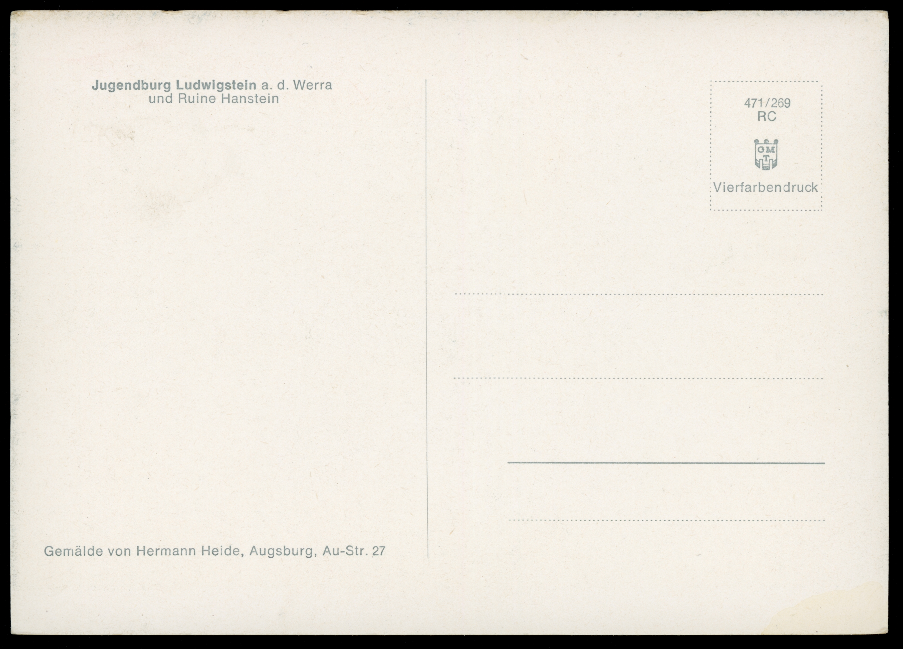 Ort Werleshausen Beschreibung Gemälde von Hermann Heide, Augsburg, Au-Str. 27 Motive Jugendburg Ludwigstein a.d. Werra und Ruine Hanstein Format groß Verlag GMT Bestell- oder Individualnummer 471/269 RC Tags Bornhagen Burg Ludwigstein Burg Hanstein Pferdefuhrwerk