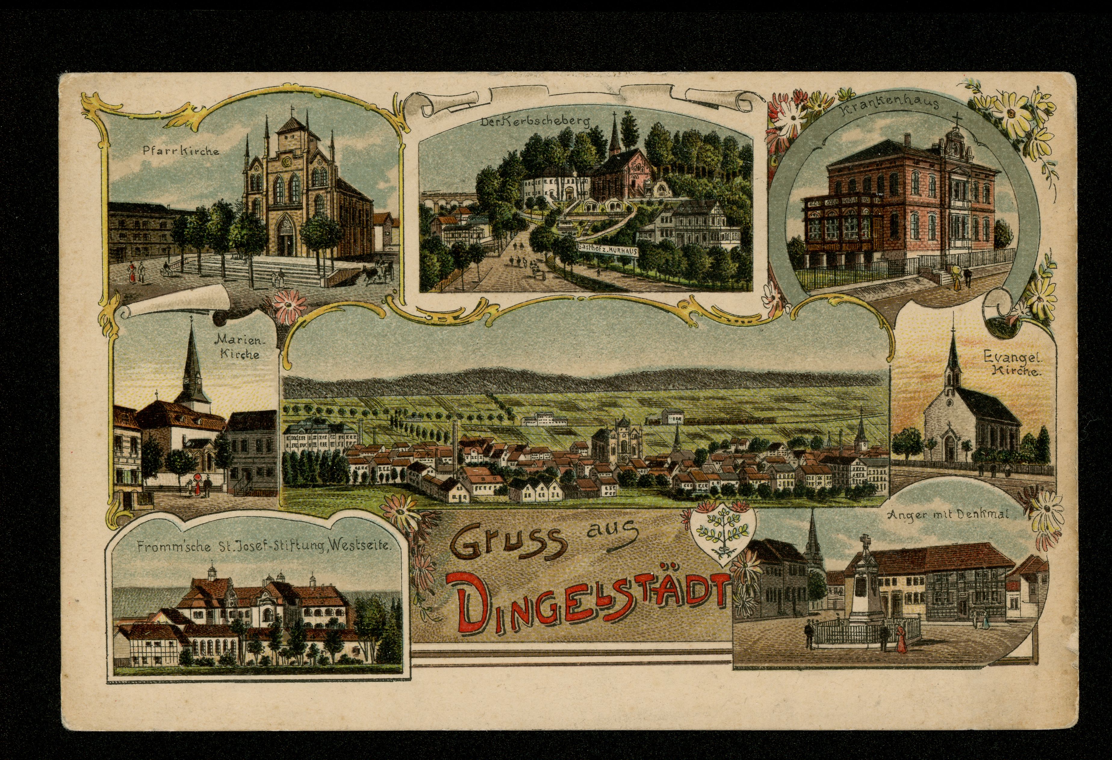 Ort Dingelstädt Motive Pfarrkirche Marien-Kirche Fromm'sche St. Josef-Stiftung, Westseite Teilansicht Der Kerbscheberg Krankenhaus Evangel. Kirche Anger mit Denkmal Format klein Verlag Hugo Wetzel, Dingelstädt Bestell- oder Individualnummer 2034 Tags Kerbscher Berg St. Josephs-Stiftung St. Maria im Busch Kleine Kirche Marienkirche