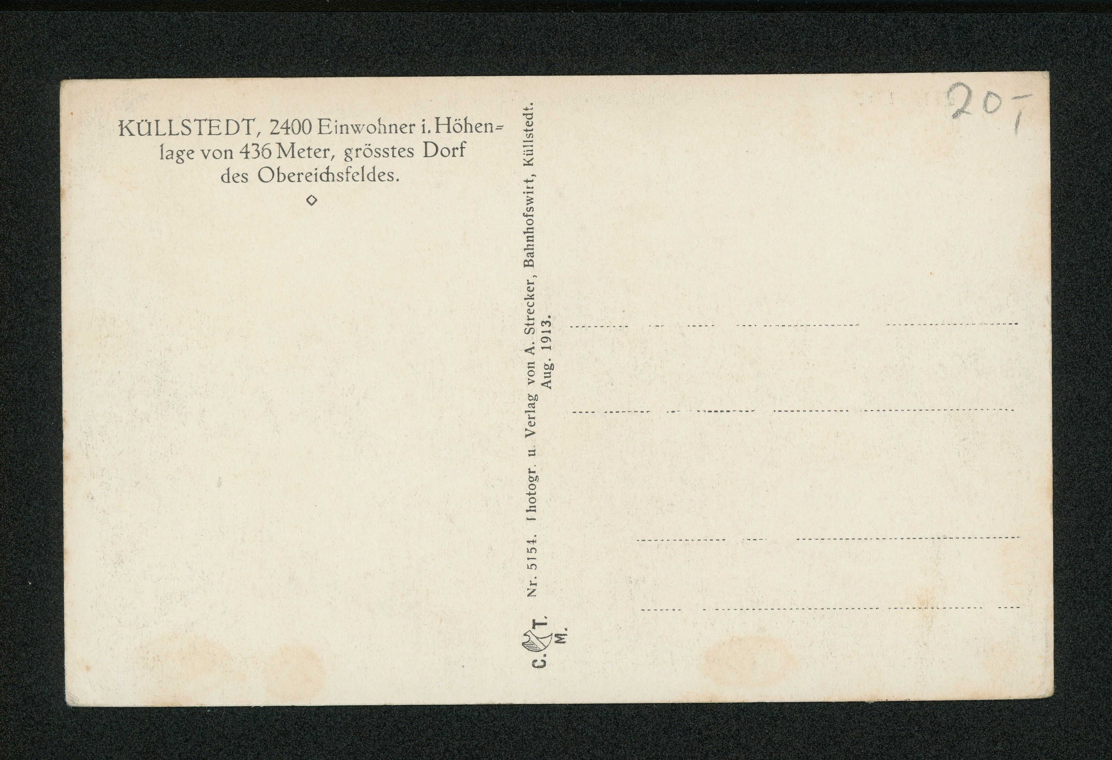 Ort Küllstedt Beschreibung Variante "einfarbig" Motive Panorama Format klein Jahr 1913 Verlag August Strecker, Küllstedt (Aug. Strecker, Gasthaus zum Lindenhof) Bestell- oder Individualnummer Nr. 5154
