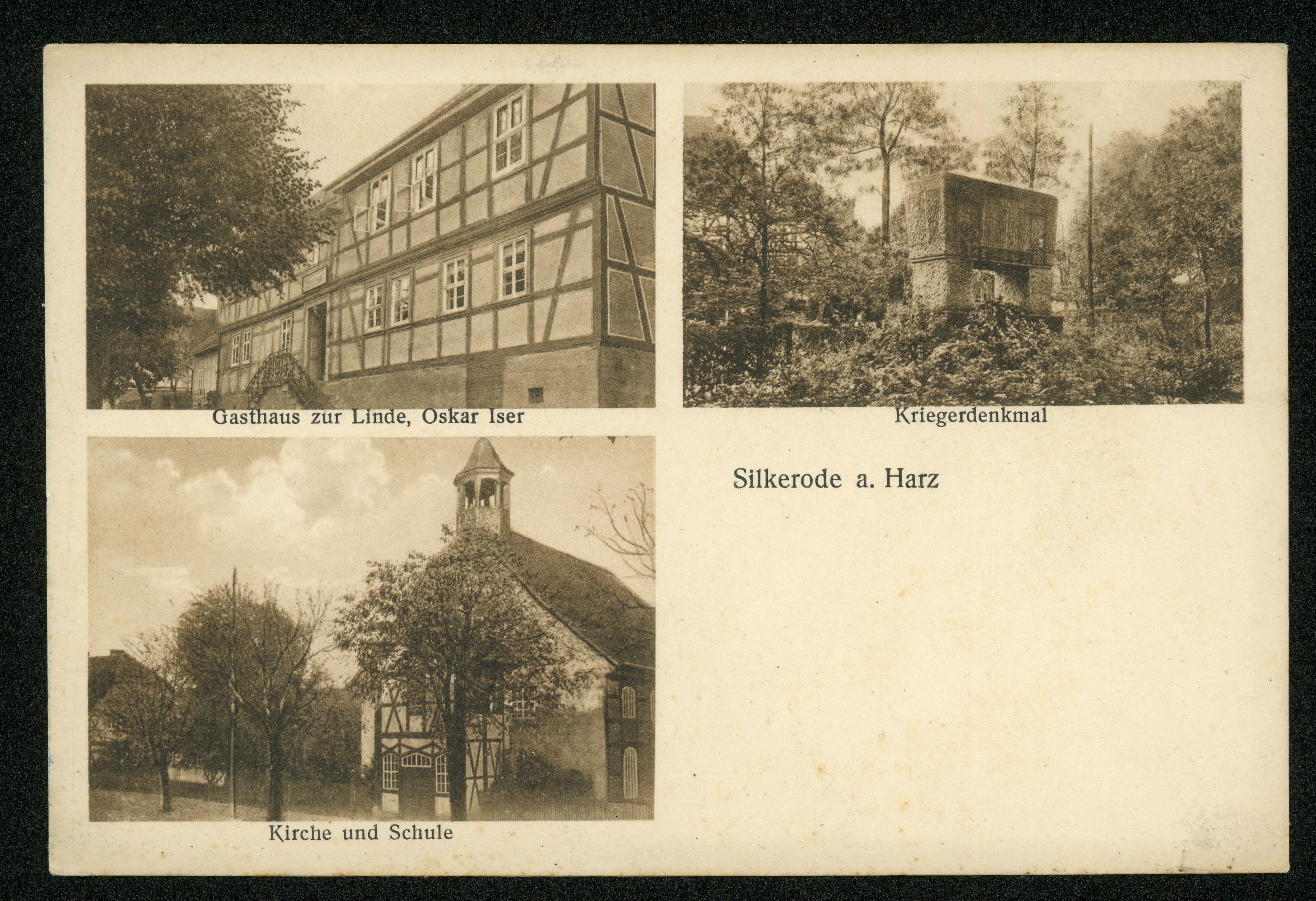 Ort Silkerode Beschreibung Sammlung: H.M.D. Motive Gasthaus zur Linde, Oskar Iser Kriegerdenkmal Kirche und Schule Format klein Verlag Aloys Mecke, Duderstadt Bestell- oder Individualnummer Nr. 418 e 88